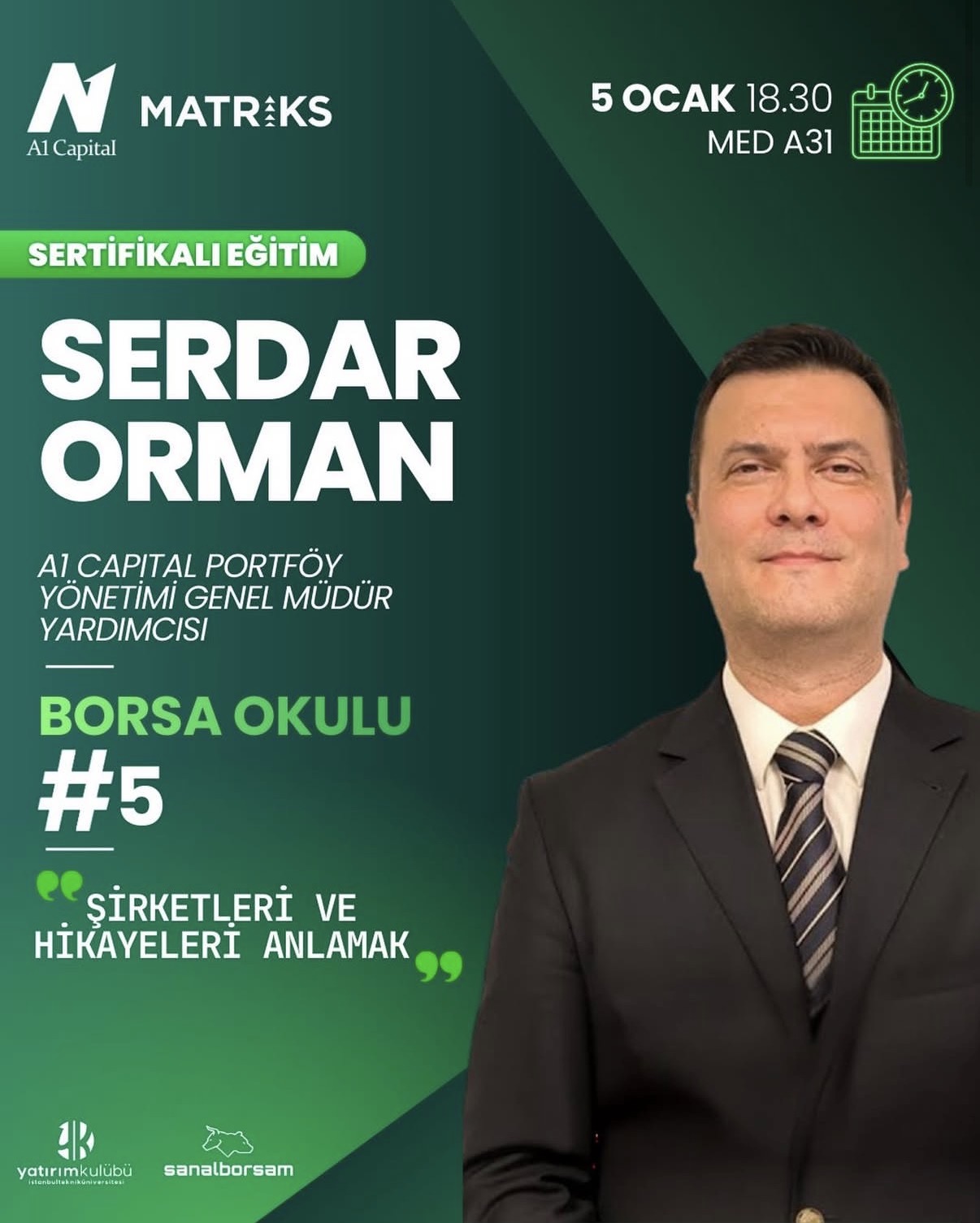 Yeni yıldaki ilk eğitimimizde, A1 Capital Portföy Yönetimi Genel Müdür Yardımcısı Serdar Orman bizlerle olacak.