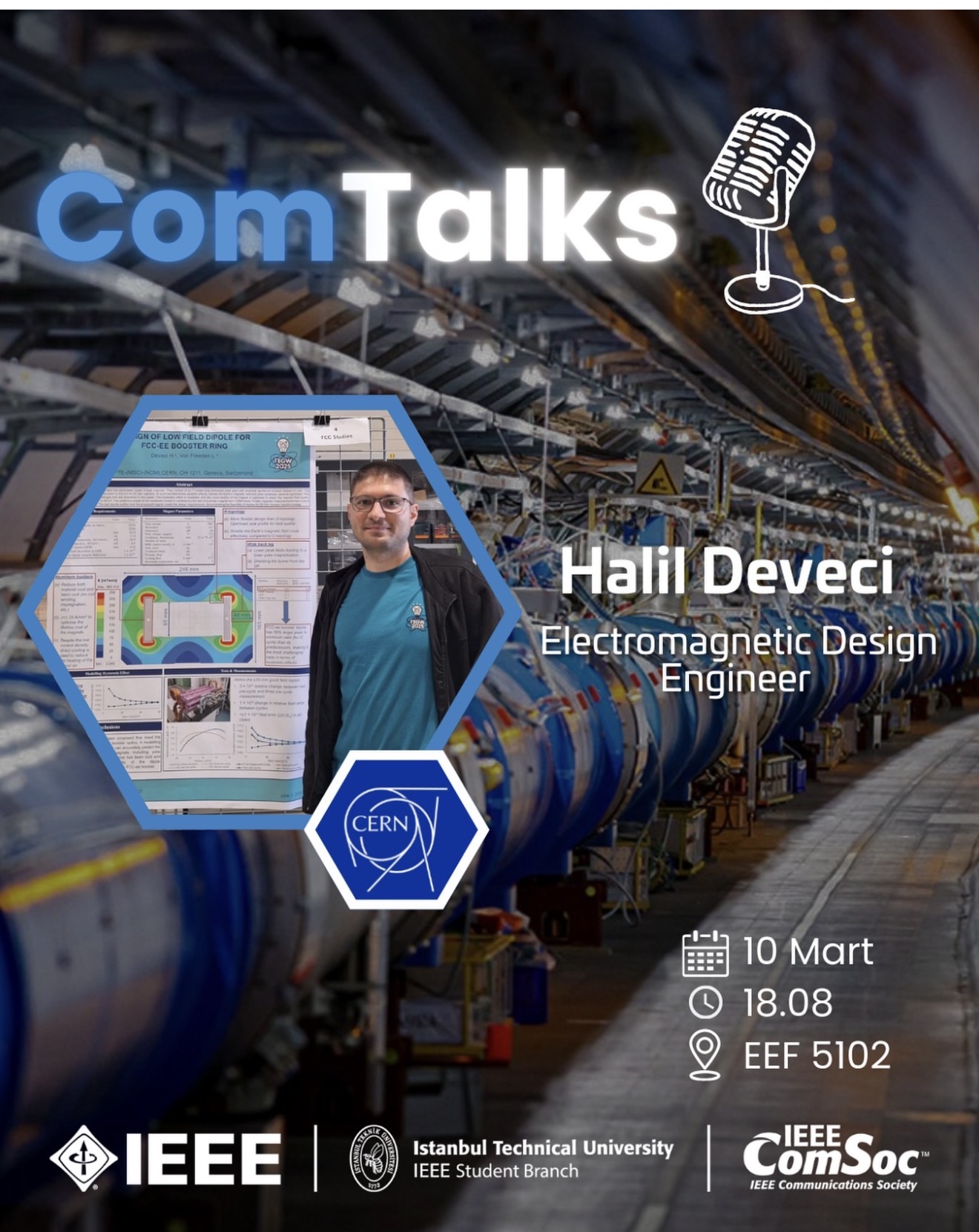 IEEE İTÜ ComSoc olarak düzenlediğimiz ComTalks etkinliginde, CERN'de Electromagnetic Design Engineer olarak çalışan Sayın Halil Deveci'yi agırlıyoruz. Kendisi parçacık hızlandırıcıların çalışma prensipleri ve projeleri üzerinde bir sunum yapacak.