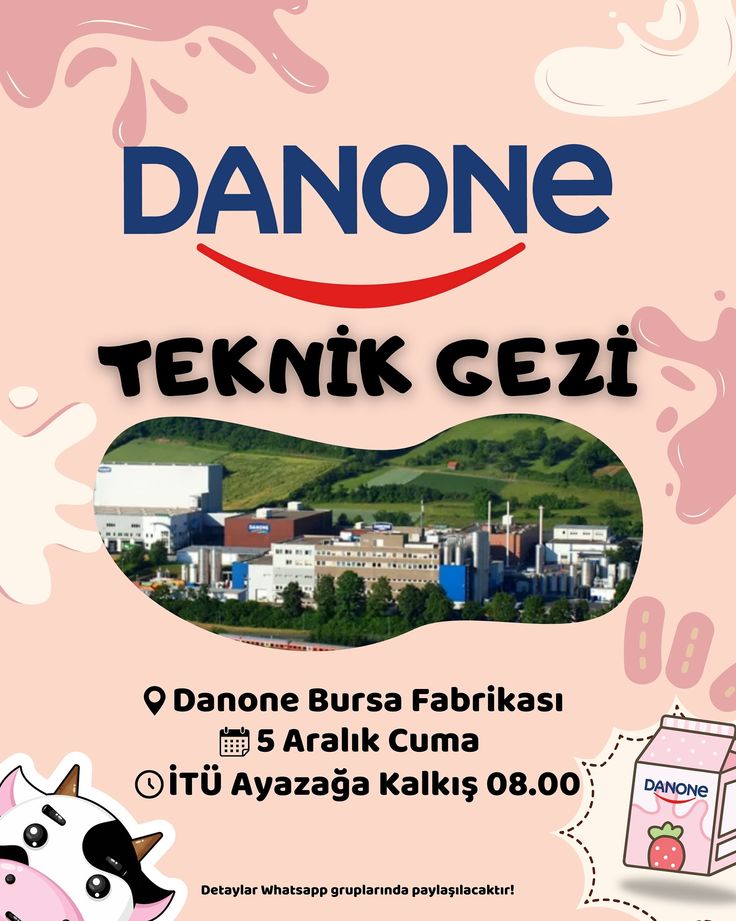 Hazır mısınız? Dönemin ikinci teknik gezisiyle Danone Bursa’ya gidiyoruz! Servisimiz 5 Aralık sabah 08.00’de Ayazağa Kampüsünden kalkıyor. Servisin vaktinde hareket edebilmesi için 07.45 de toplanmış olacağız. Fabrika sahasını yerinde görüp üretim sürecini keşfetmek için sabırsızlanıyoruz! Az sayıdaki kontenjan için acele edin!