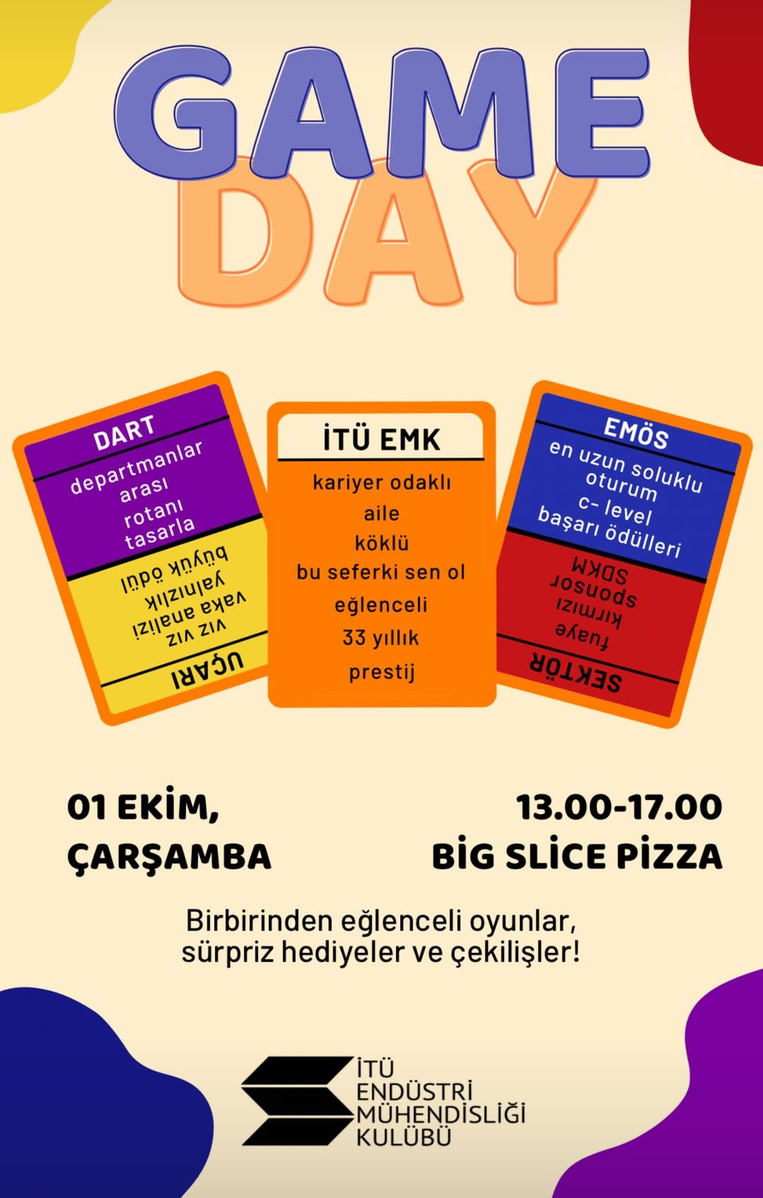 Game Day, İTÜ Endüstri Mühendisliği Kulübü’nün en eğlenceli etkinliklerinden biri! Gün boyunca bolca oyun, sürpriz hediyeler ve çekilişlerle keyifli anlar seni bekliyor. Hem arkadaşlarınla birlikte eğlenip yeni insanlarla tanışabileceğin, hem de kulübün dinamik ortamını yakından görebileceğin harika bir fırsat. Eğlence, enerji ve sürprizlerle dolu bu günü kaçırma!