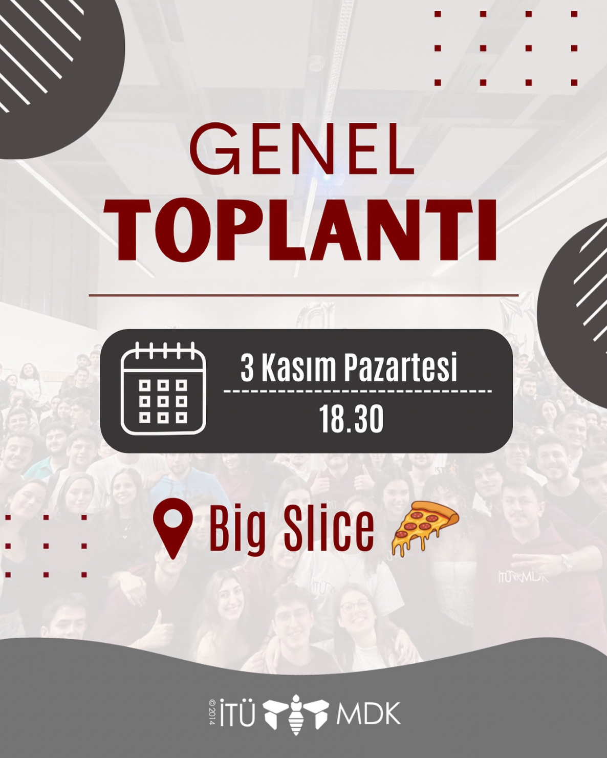 İTÜ MDK ailesi olarak ikinci genel toplantimizda yeniden bir araya geliyoruz! Yeni dönem çalismalarini konusmak ve güzel bir akgam geçirmek için seni de bekliyoruz!