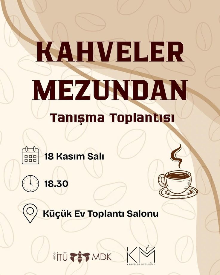 Herkese merhaba! Bu dönem Kahveler Mezundan olarak ilk tanışma toplantımızda bir araya geliyoruz! Hem komitemizi hem dönem planlarımızı anlatacağımız hem de mini ödüllü bir quiz ile eğleneceğimiz keyifli bir buluşma yapacağız. Kahveler Mezundan’ı daha yakından tanımak, etkinliklerde nasıl yer alabileceğinizi öğrenmek ve küçük sürpriz ödüller için quize katılmak isterseniz mutlaka bekliyoruz.