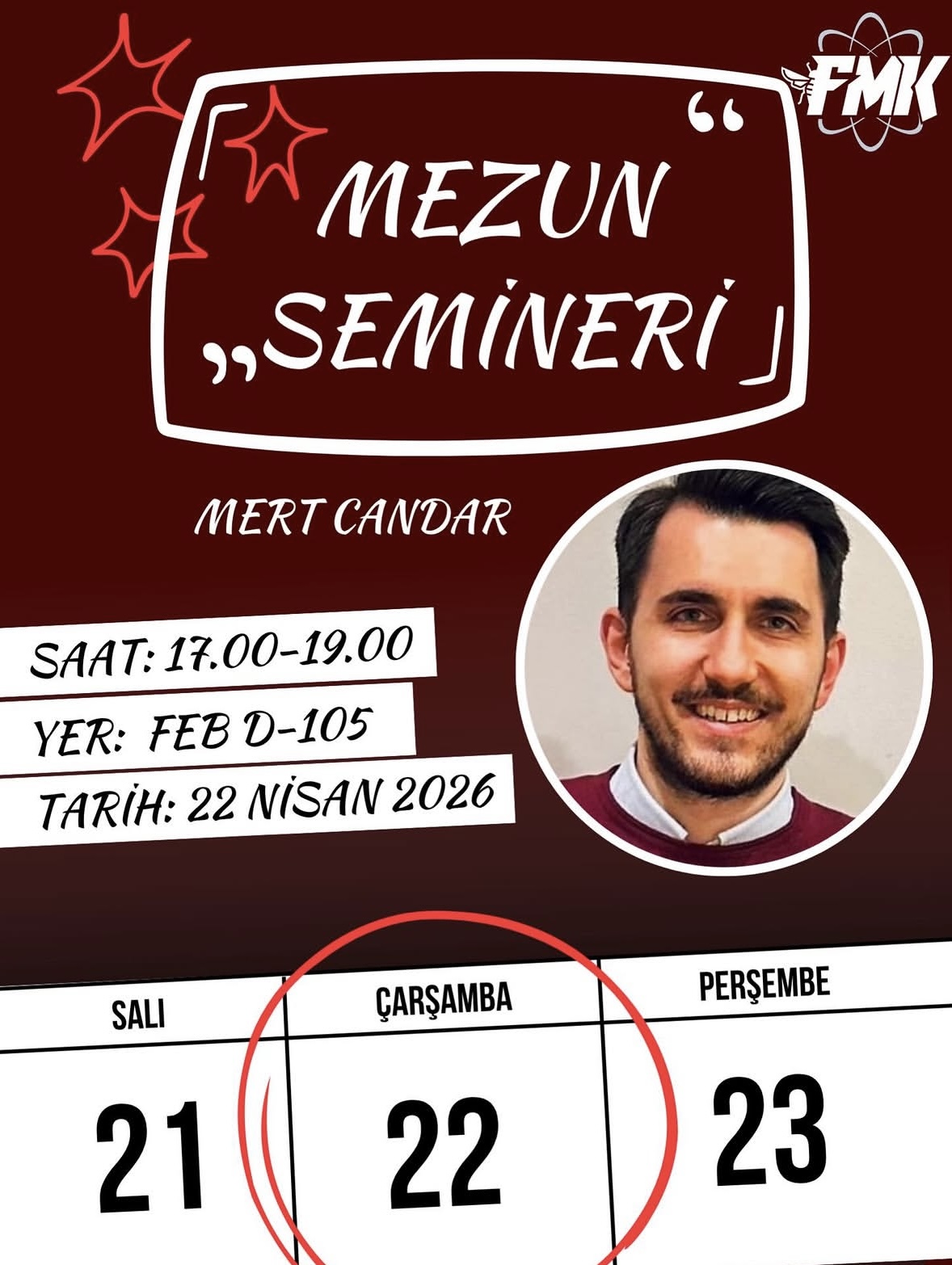 Değerli mezunumuz Mert Candar ile buluşuyoruz.Mezuniyet sonrası kariyer yolculuğunu, öğrencilikten iş hayatına geçiş sürecini ve bu süreçte edinilen deneyimleri değerli mezunumuz Mert Candar bizimle paylaşacak. Kariyerine yön vermek, farklı perspektifler kazanmak ve merak ettiğin sorulara doğrudan yanıt bulmak için seni de bu keyifli buluşmaya bekliyoruz!