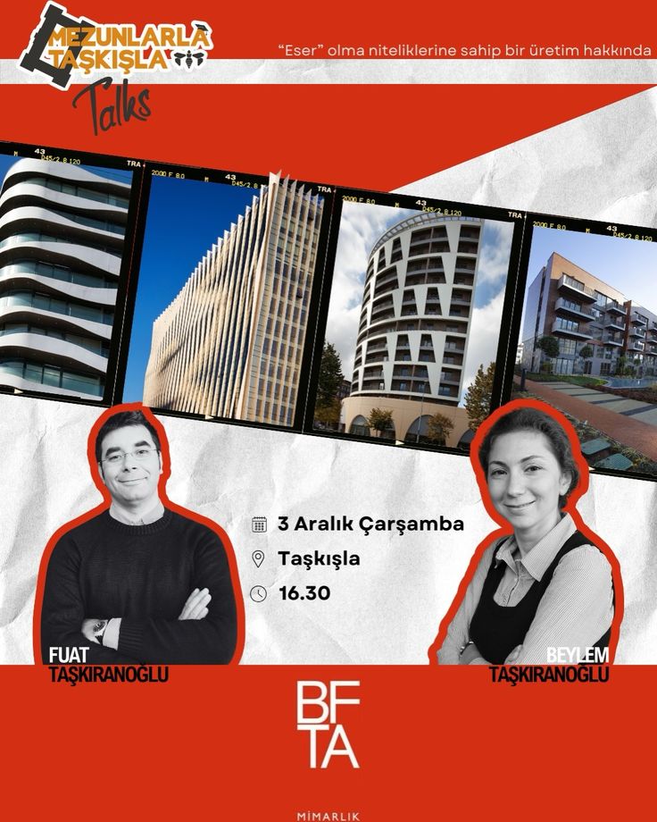 Mezunlarla Taşkışla Talks’ta bu hafta BFTA’nın kurucu ortakları Fuat Taşkıranoğlu ve Beylem Taşkıranoğlu bizlerle! Mimarlıkta “eser niteliği taşıyan üretim” yaklaşımını, projelerinin arka planındaki tasarım düşüncesini ve çağdaş üretim pratiklerini konuşacağız. Tüm öğrenciler ve mezunlar davetlidir. Kontenjanlarımız sınırlıdır, katılım formunu doldurabilirsiniz!