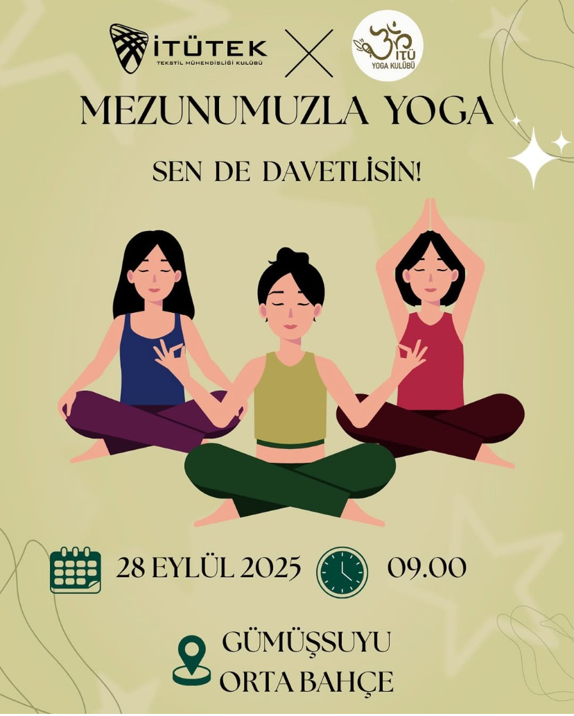 İTÜTEK olarak Yoga Kulübü ile birlikte çok keyifli bir yoga etkinliği düzenliyoruz! İTÜ mezunu Elif Özer eşliğinde hem zihnimizi hem bedenimizi dinlendirmek için seni de bekliyoruz. Kontenjanlar sınırlı, kaçırma!