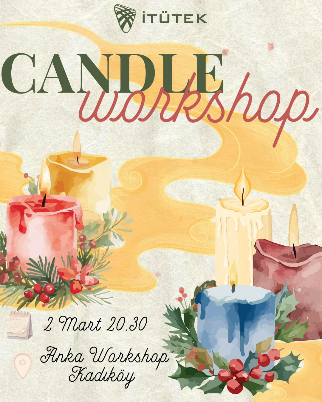 Kendi mumumuzu tasarlayacağımız bu etkinlikte hem üretim sürecini deneyimleyecek hem de keyifli bir akşam geçireceğiz. Günlük yoğunluğun arasında biraz durmak ve farklı bir deneyim yaşamak isteyenler için güzel bir plan. Katılmak için formu doldurmanız yeterlidir.