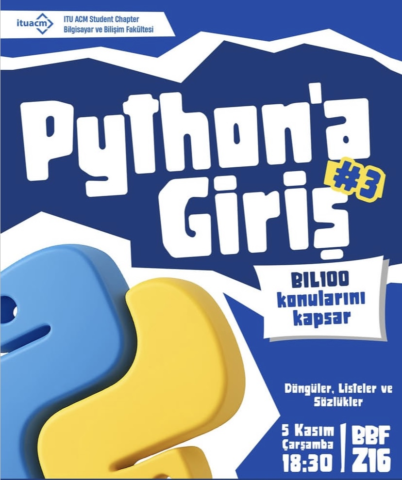 Ücretsiz Phyton eğitimi serisi üçüncü haftasında "Döngüler,listeler ve Sözlükler" konusuyla devam ediyor.Önceki haftalar katılmadıysanız katılmak için geç değil. Katılmak için Linke tıklayabilirsiniz.