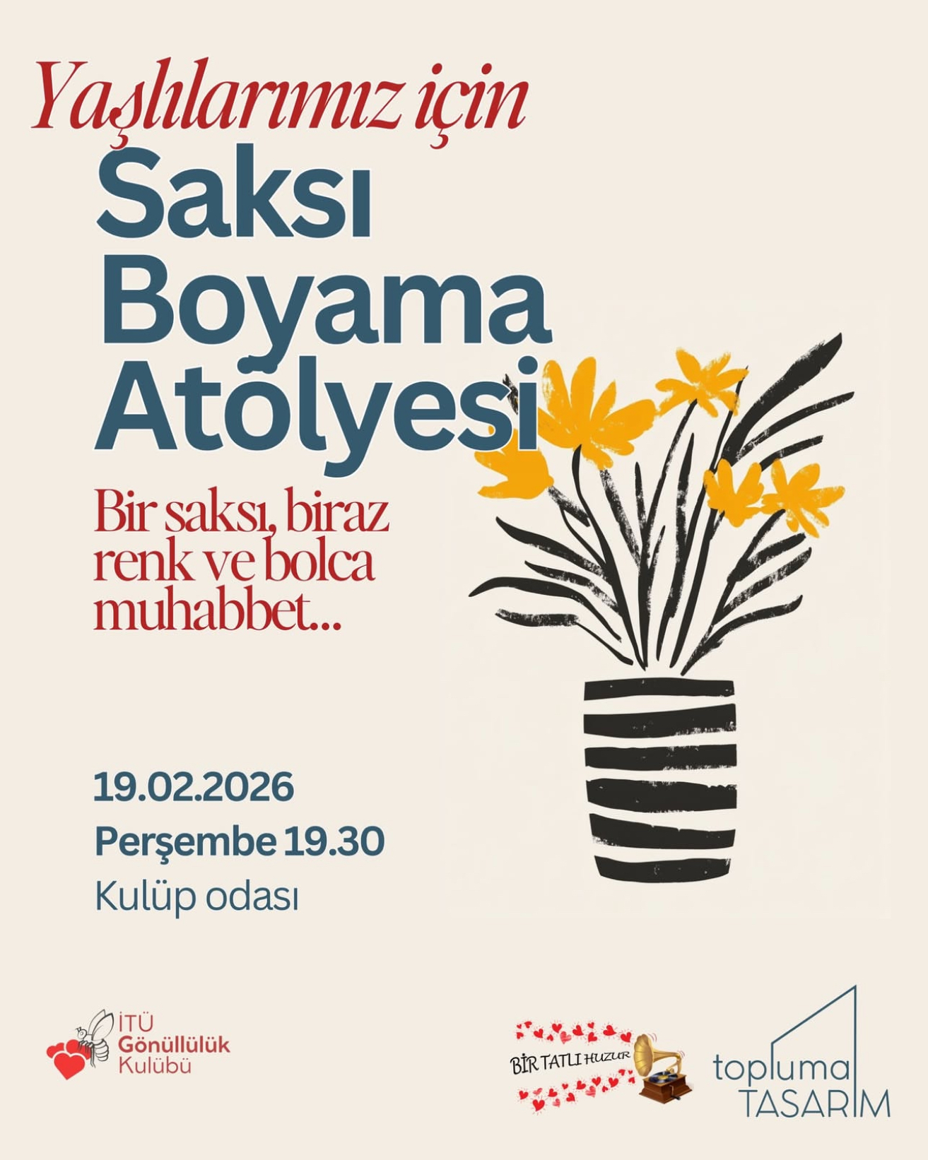 Yaşlılarımız için saksı boyama atölyesinde buluşuyoruz!Topluma Tasarım ve Bir Tatlı Huzur projesi kapsamında, birlikte üretmenin ve paylaşmanın iyileştirici gücünü deneyimliyoruz.Kontenjan kısıtlıdır. Katılmak için formu doldurunuz.