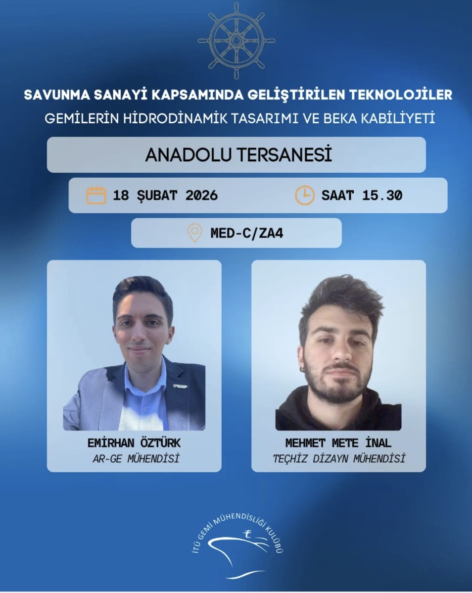 Anadolu Tersanesi ile "Savunma Sanayi Kapsamında GeliştirilenTeknolojiler ile Gemilerin Hidrodinamik Tasarımı ve BekaKabiliyeti" başlığı altında verimli ve keyifli bir seminer gerçekleştirecegiz.