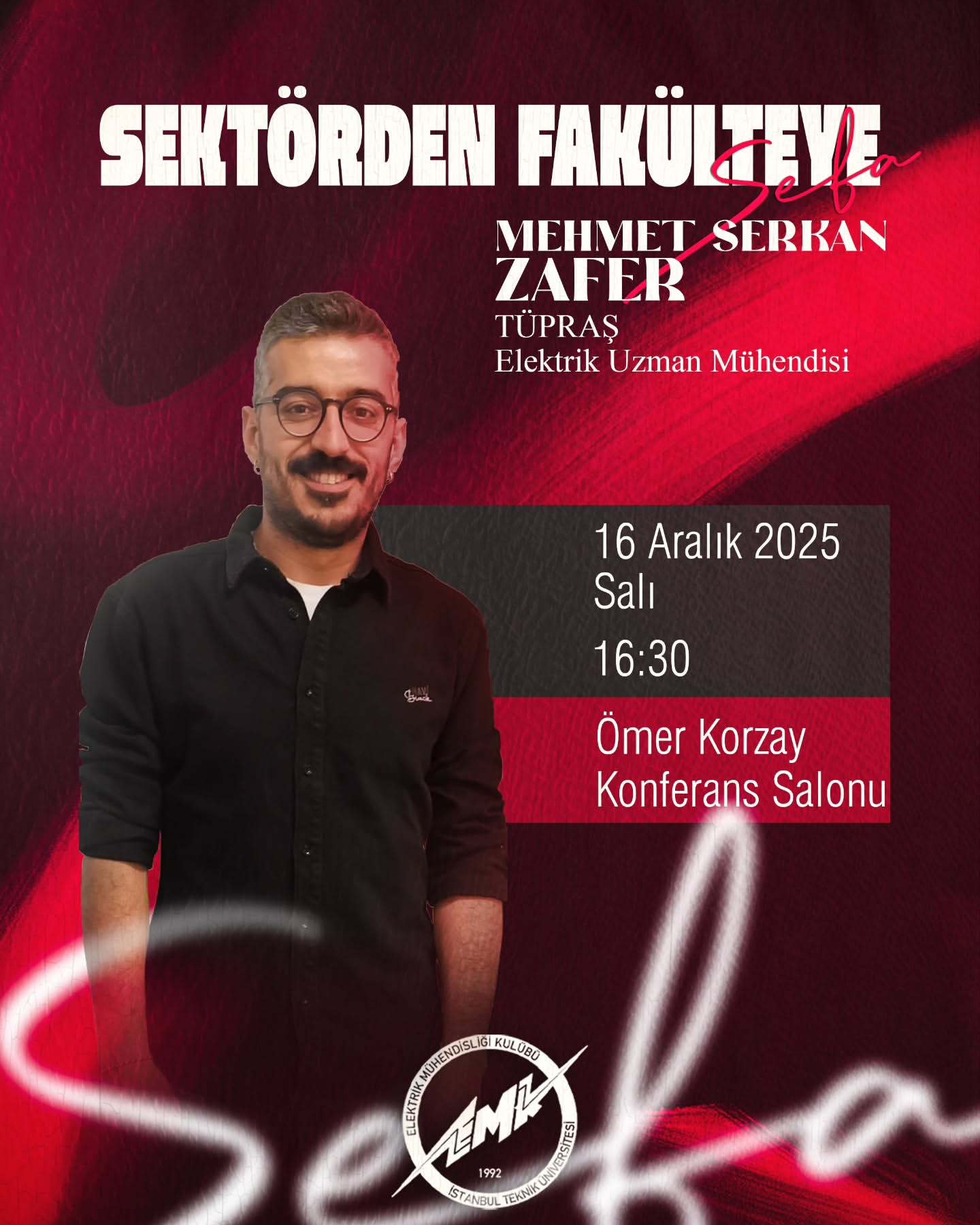 Sektörden Fakülteye etkinliğimizin bir yenisiyle sizlerleyiz! İTÜ Elektrik Mühendisliği'nden mezun Mehmet Serkan Zafer şu anda Tüpraş'ta Elektrik Uzman Mühendisi olarak görev yapmaktadır. Sektöre dair bilgi kazanmak ve sorularını sormak isteyen herkesi bekliyoruz!