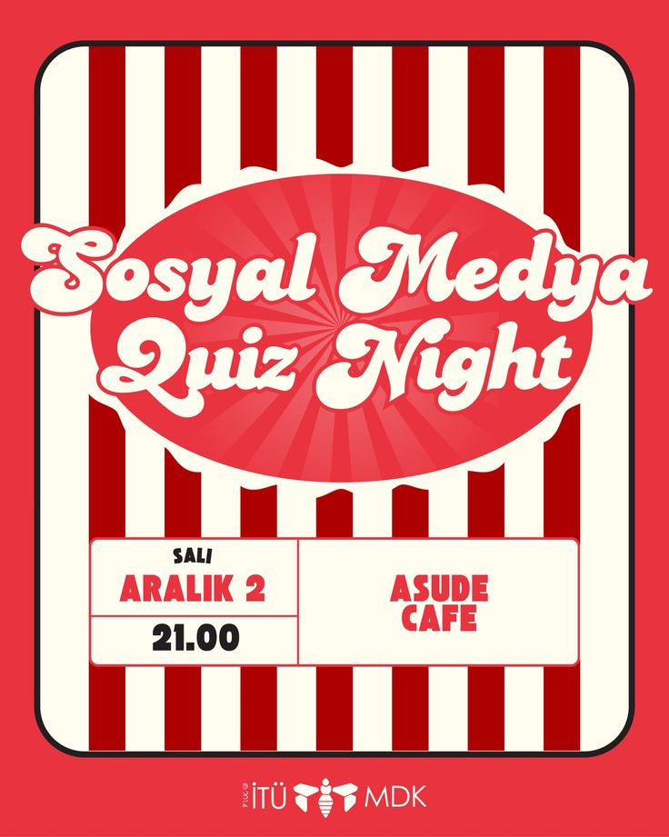 2 Aralık Salı günü saat 21.00’da güncel, viral ve “aaa bunu kesin görmüşsünüzdür” sorularıyla dolu eğlenceli bir Quiz Night’ta buluşuyoruz! Bol kahkaha, bol rekabet ve bol eğlence seni bekliyor. Takımını kur, yerini kap! (Kontenjan: Max 3 kişilik 12 grup)