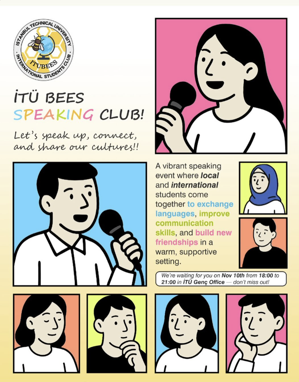 A vibrant speaking event where local and international students come together to exchange languages, improve communication skills, and build new friendships in a warm, supportive setting. Let's speak up, connect, and share our cultures!!