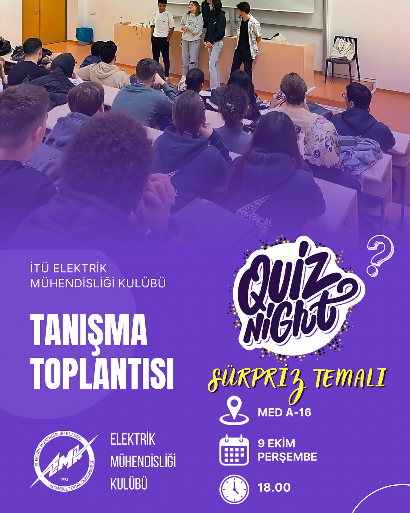 Sürpriz sorular, ilginç konular ve güzel oyunlar sizi bekliyor! İTÜ’nün en prestijli etkinliklerini düzenleyen Elektrik Mühendisliği Kulübü ailesiyle tanışabileceğiniz, çeşitli etkinlikler ve oyunlarla zaman geçirebileceğiniz Tanışma Toplantısı sizleri bekliyor! Hepinizle tanışmak için can atıyor, sizleri Quiz Gecemize davet ediyoruz