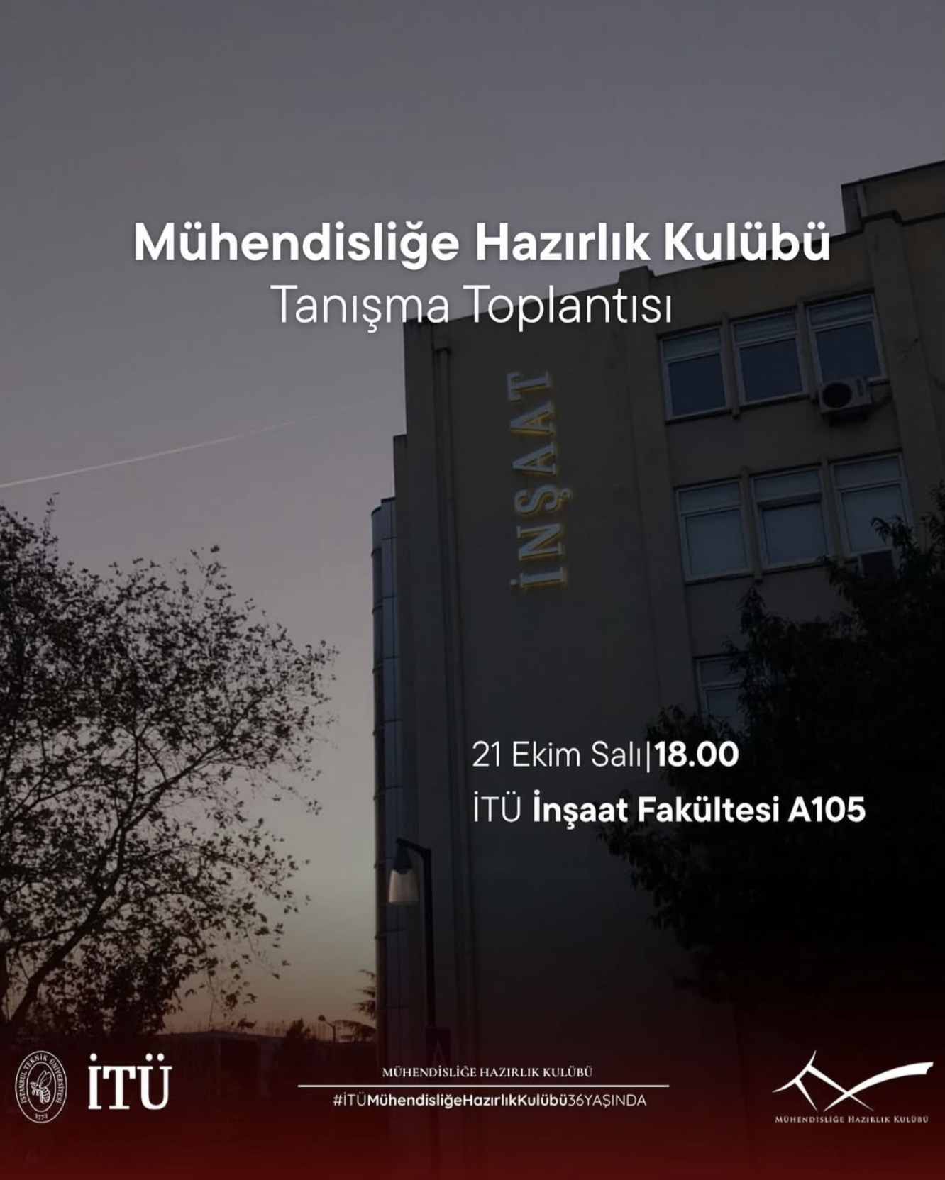 21 Ekim 2025 Salı günü saat 18.00’de İnşaat Fakültesi A105 sınıfında gerçekleştireceğimiz tanışma toplantımıza davetlisiniz! 36 Yıllık Bilgi Birikimimizle sizleri tanıştırmak için sabırsızlanıyoruz.