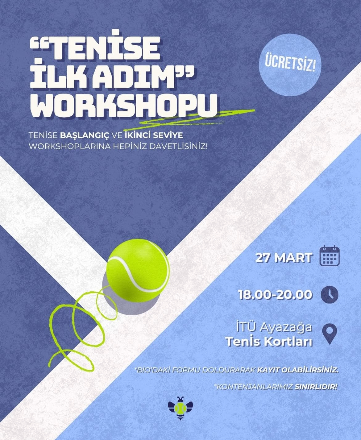 İTÜ Tenis Kulübü olarak gerçekleştirdiğimiz ve büyük ilgi gören tenis workshoplarımız yeniden başlıyor! Sizleri Başlangıç Seviyesi ve İkinci Seviye Workshop derslerimize davet ediyoruz.