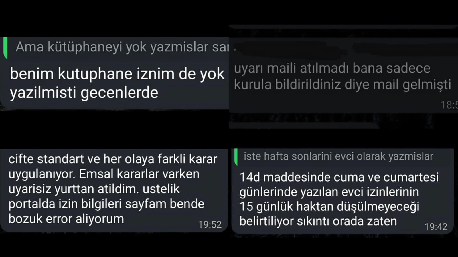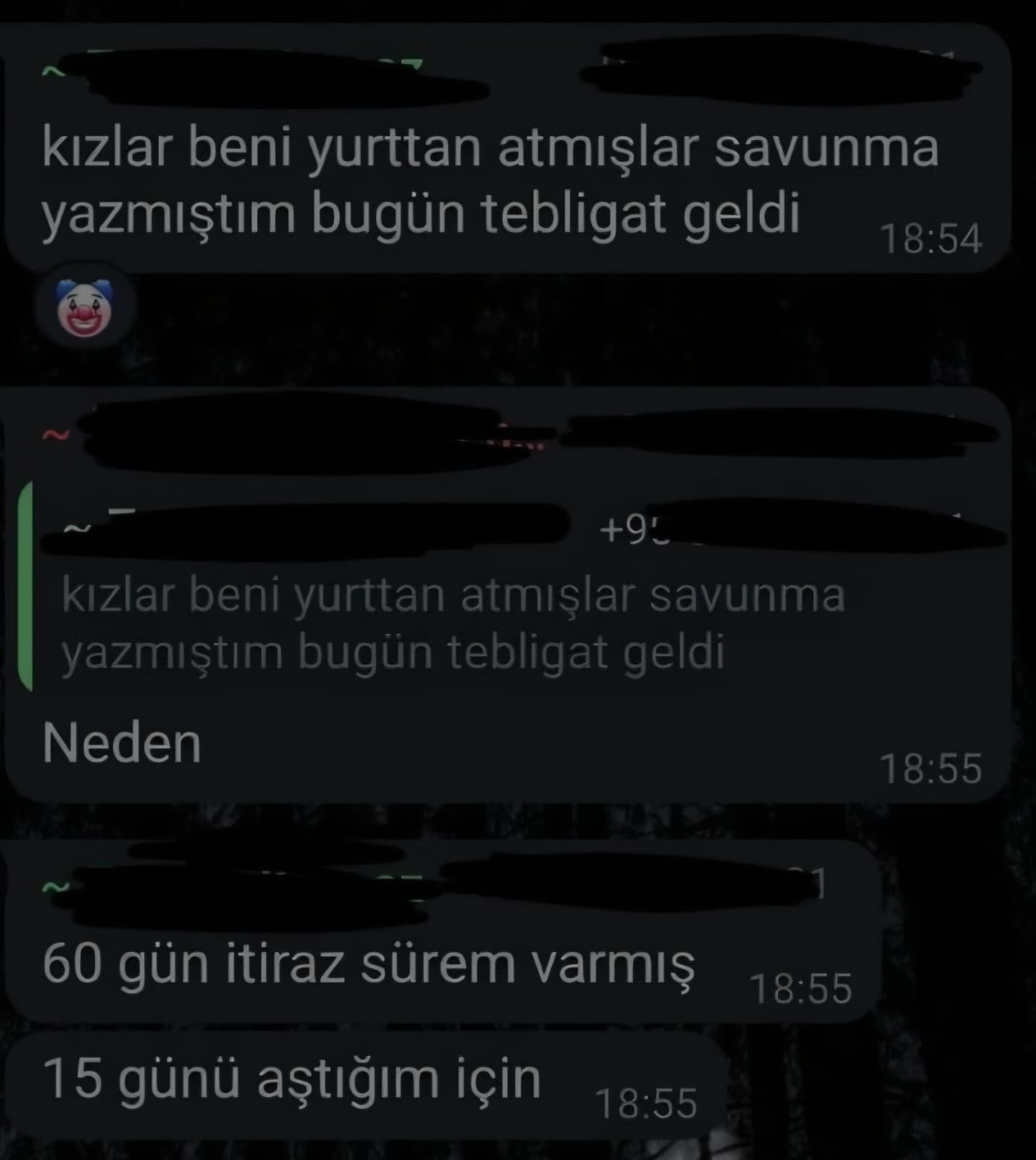 Öğrenciler herhangi bir uyarı, bilgilendirme ya da görüşme yapılmadan önce doğrudan tebligat aldıklarını belirtti. Yurt yönergesinde üniversite ile ilişiği kesilen öğrencilerin 7 iş günü içinde çıkış şartının yer aldığı ifade ediliyor. Aynı süre yurtla ilişiği kesilen öğrencilerin çıkış tarihi için de geçerli.