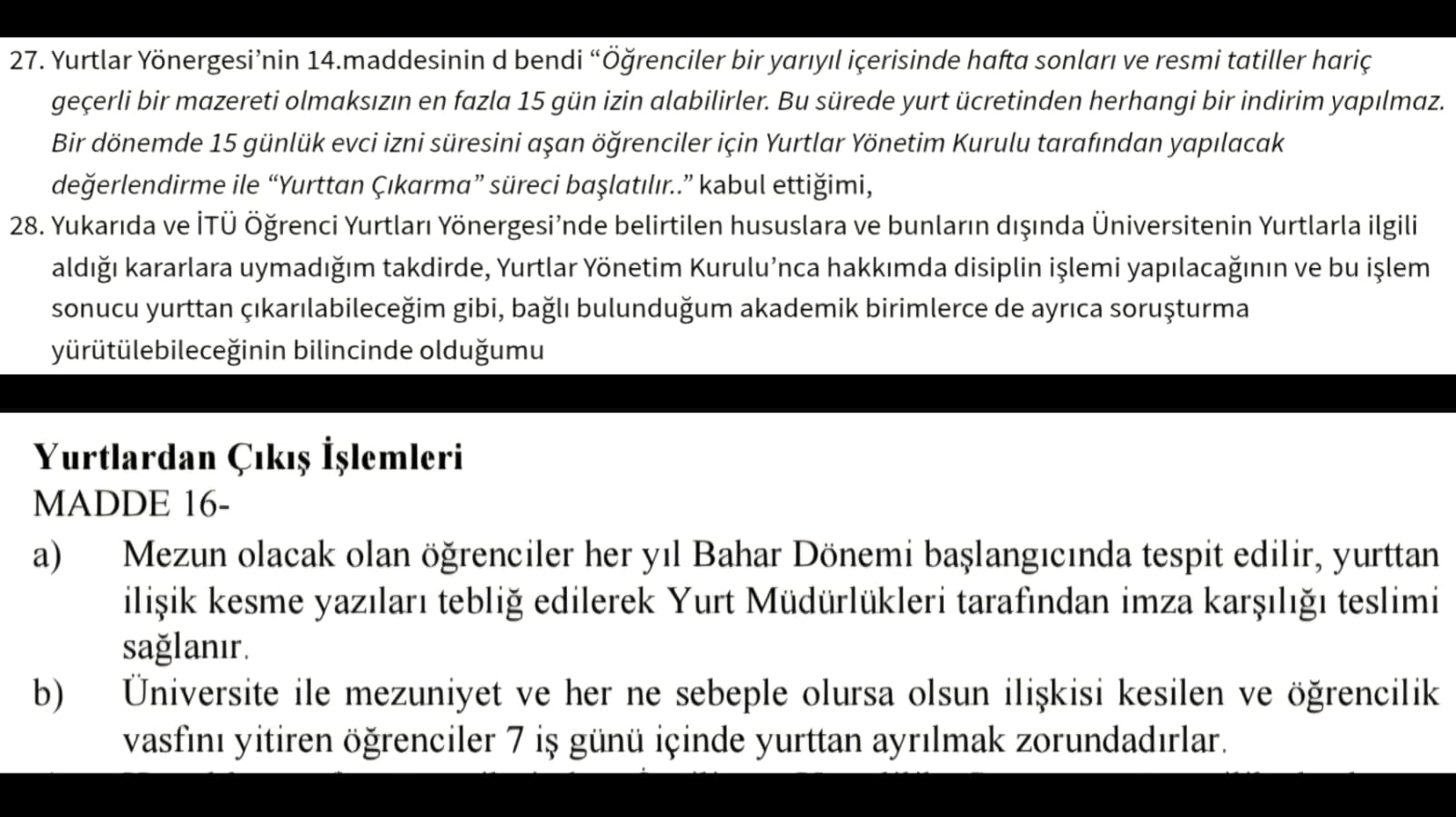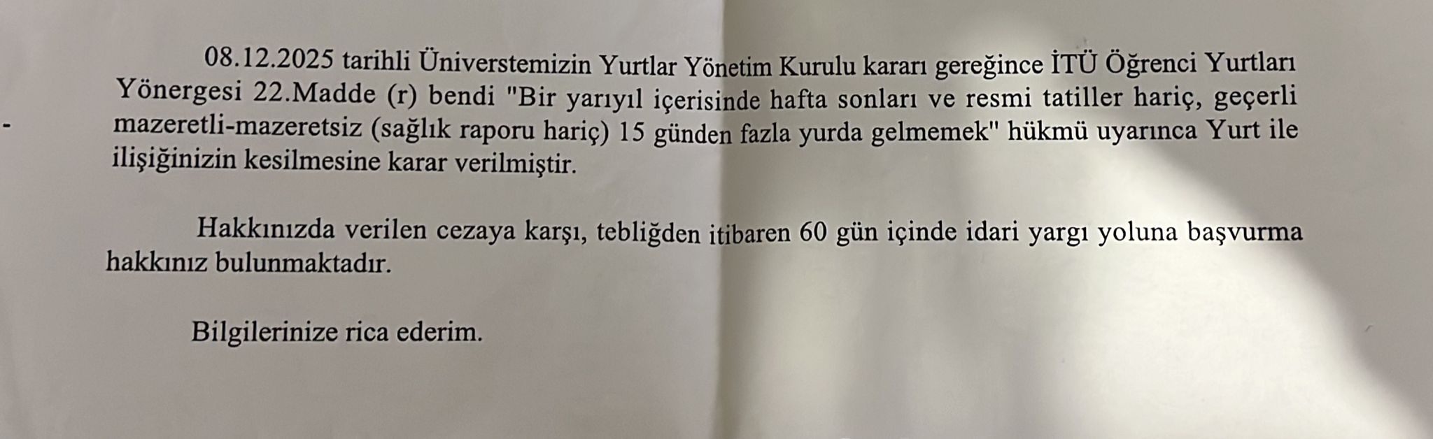 İstanbul Teknik Üniversitesi Ayazağa Kampüsü’nde bulunan Altan Edige Kız Öğrenci Yurdu’nda kalan iki öğrenci, 15 günlük izin haklarını aştıkları gerekçesiyle yurttan çıkarılmalarına yönelik tebligat aldıklarını açıkladı. Öğrenciler, bu kararın kendilerine daha önce hiçbir uyarı yapılmadan iletilmesine ve akademik dönem devam ederken uygulanmasına tepki gösteriyor. Üniversite yönetiminin, barınma hakkı açısından kritik bir karar olan yurt ilişiği kesme uygulamasının, öğrencilerin hazırlık yapmasına fırsat tanımadan hayata geçirmesi; kampüste, yurt kurallarının şeffaflığı ve uygulama süreçlerinin adaleti konusunda yoğun tartışmalara yol açmış durumda.