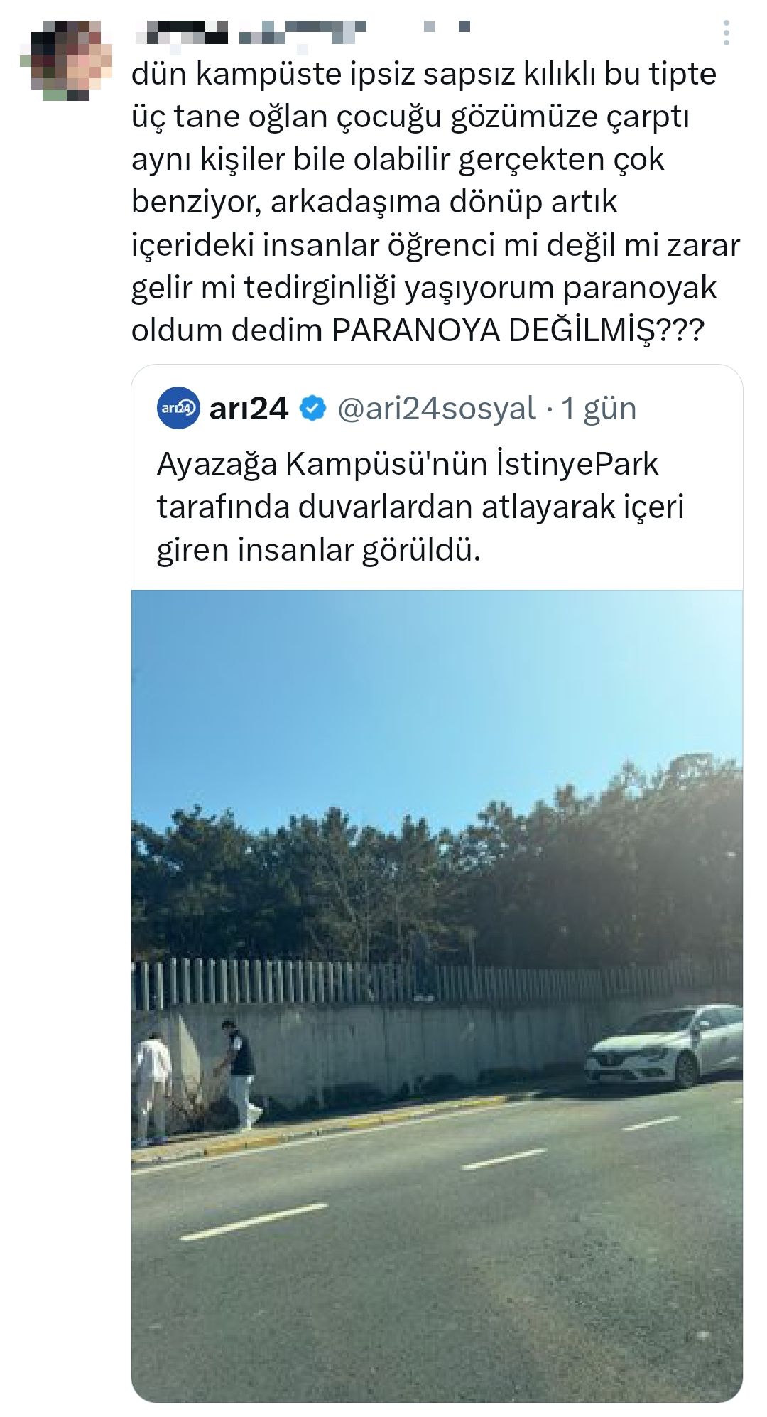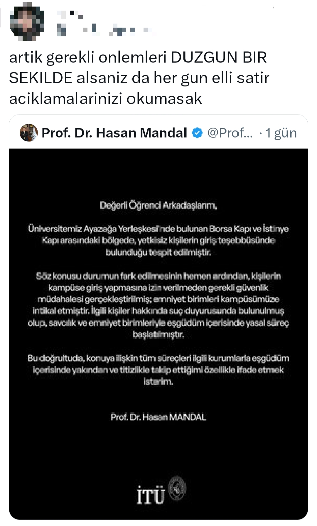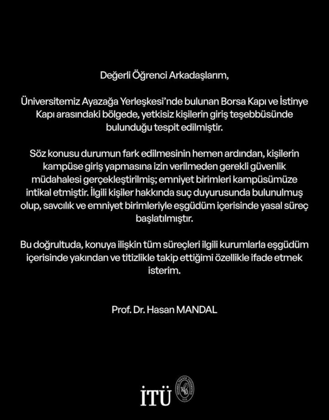 Pazar günü öğleden sonra Borsa Kapı ile İstinye Kapı arasındaki bölgede üç erkek şahıs görüntülendi. Şahıslar duvardan atlayarak İTÜ Ayazağa Kampüsü'ne giriş yapmaya çalıştı. Hasan Mandal'ın paylaştığı duyuruda durumun fark edilmesiyle giriş teşebbüsünün engellendiği iletildi. Ayrıca emniyet güçlerinin kampüse gelmesi ile söz konusu kişiler hakkında suç duyurusunda bulunularak yasal süreç başlatıldığı da belirtildi.