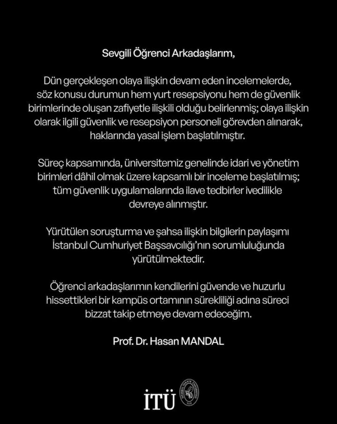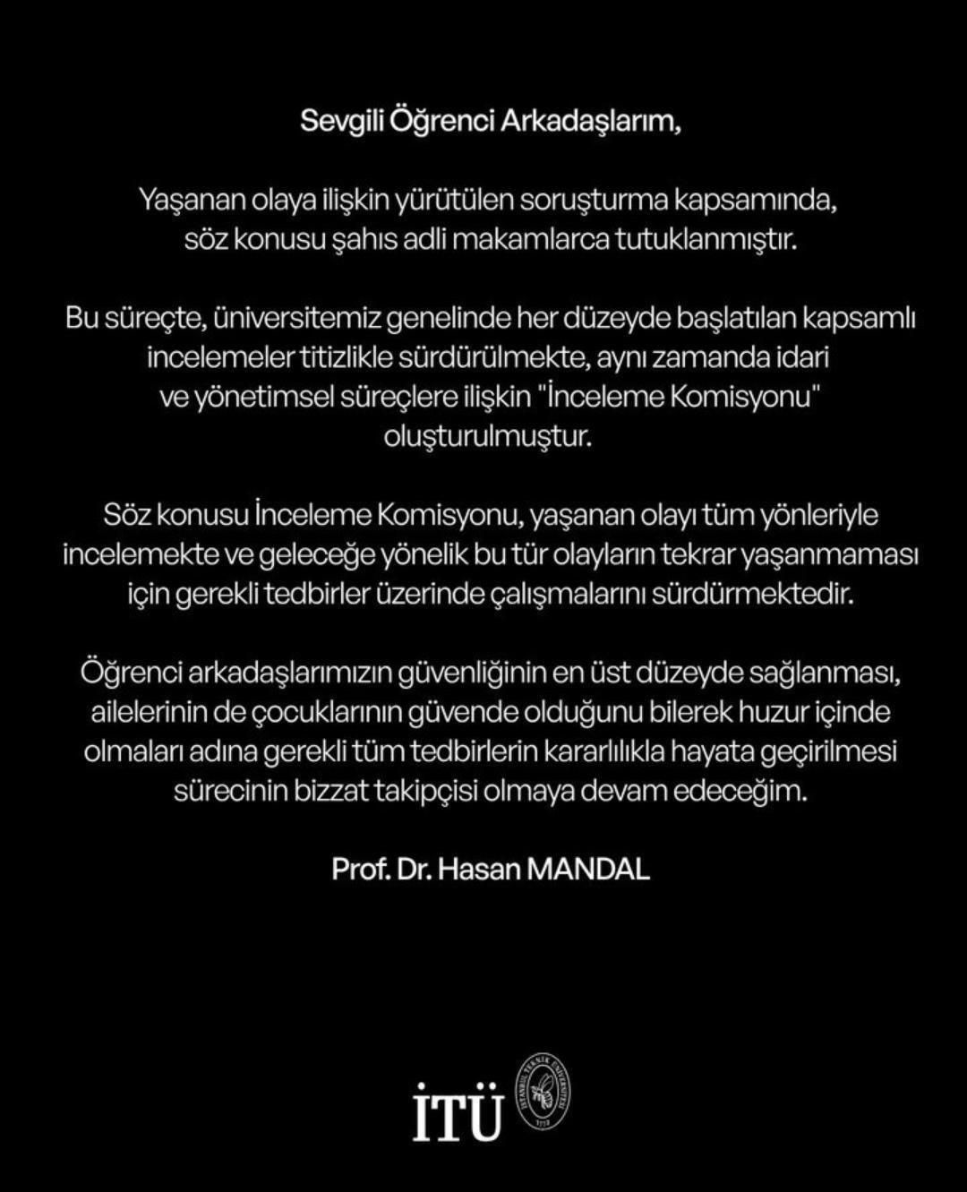 Kampüs güvenliğinin anlık bir konu olarak değil de bütüncül bir yaklaşımla ele alındığını belirten Mandal, oluşturdukları İnceleme Komisyonu'na öğrenci temsilcilerinin de katılımını sağlayacağını belirtti. Ayrıca öğrencilerden oluşan "Yurt Süreçleri Geliştirme Komisyonu" da oluşturulacağının bilgisini verdi.