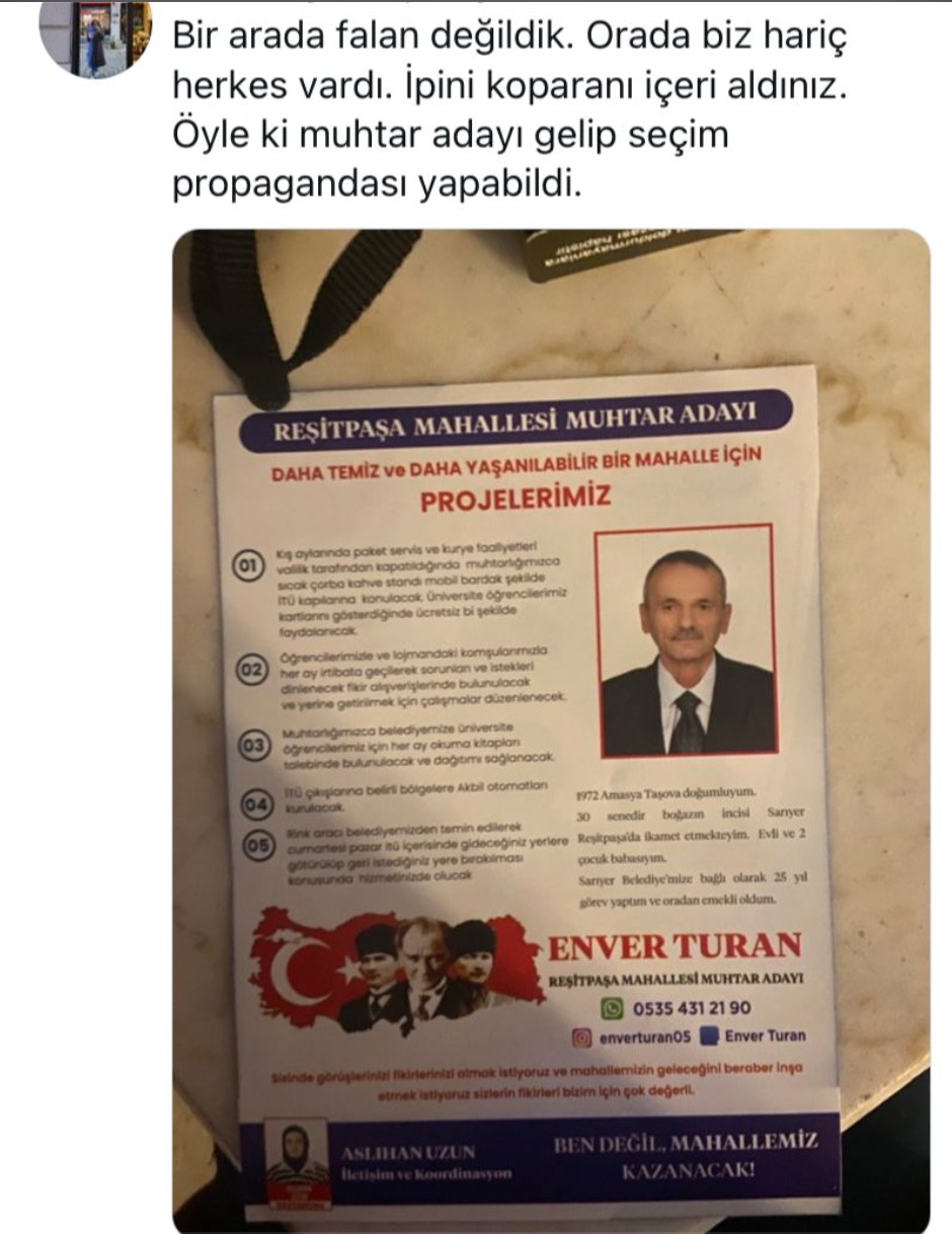 Herkese açık olması nedeniyle her yıl öğrenciler arasında tartışma konusu olan İTÜ iftarının olduğu gün ise kampüste bir muhtar adayının broşürleri dağıtılmıştı. İTÜ'nün öğrenci kulüpleri etkinlik afişlerini asmak için kaşeli onay alırken üniversitelere siyasi broşürlerin girmesi de İTÜ gündemine düşmüştü.