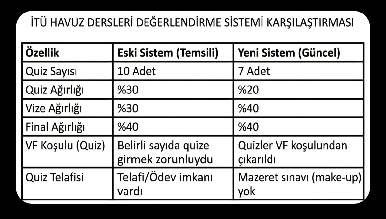 Öğrencileri en çok zorlayan "tüm quizlere girme zorunluluğu" tamamen kaldırıldı. Artık quizler VF koşulu olmaktan çıkarıldı yani quizlere katılmamak sizi doğrudan dersten bırakmayacak. Finale girebilmek için sadece %70 devam zorunluluğunu sağlamanız ve vize sınavına girmiş olmanız yeterli olacak. Ancak dikkat edilmesi gereken nokta, quizlerin artık hiçbir şekilde mazeret sınavı olmayacak, kaçırılan quizin telafisi yapılamayacak. Bu da kaçırdığınız her bir quiz için dönüşümsüz olarak ortalamanızın negatif etkilenmesine sebep olacak.