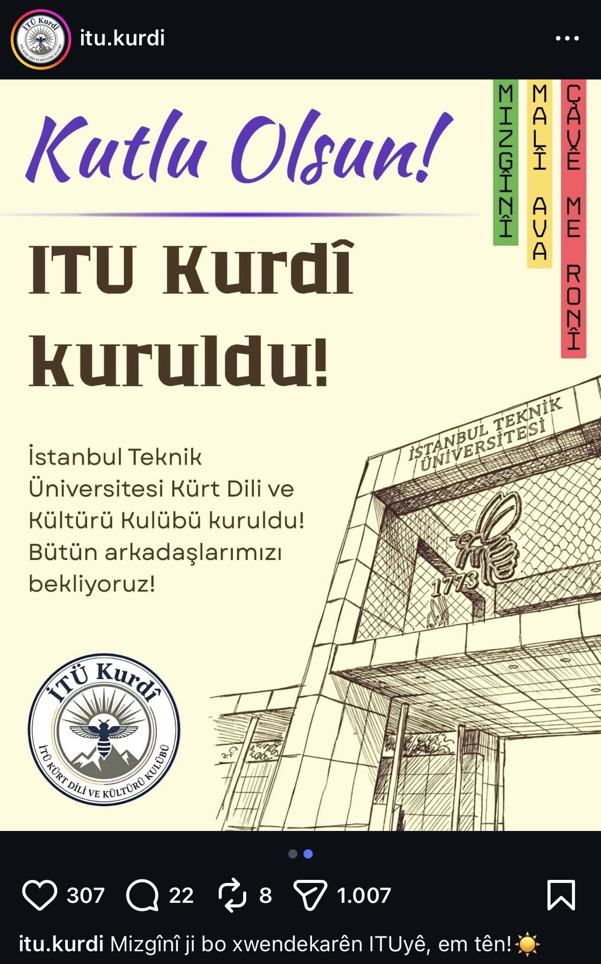 İTÜ’de Kültür ve Sanat Kulüpleri bünyesinde faaliyetlerine başlamaya hazırlanan İTÜ Kürt Dili ve Kültürü Kulübü, sosyal medya üzerinden kuruluş duyurusunu yapmasının ardından hem destek hem de eleştirilerin hedefi oldu. Kulübün sosyal medya hesabı üzerinden yaptığı paylaşım, tartışmaları da beraberinde getirdi.