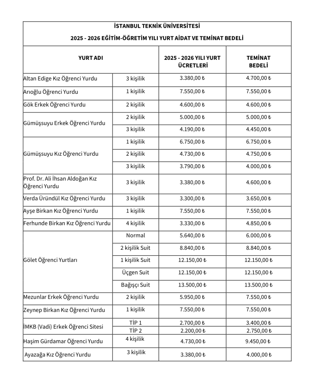 2025-2026 İTÜ yurt fiyatları
