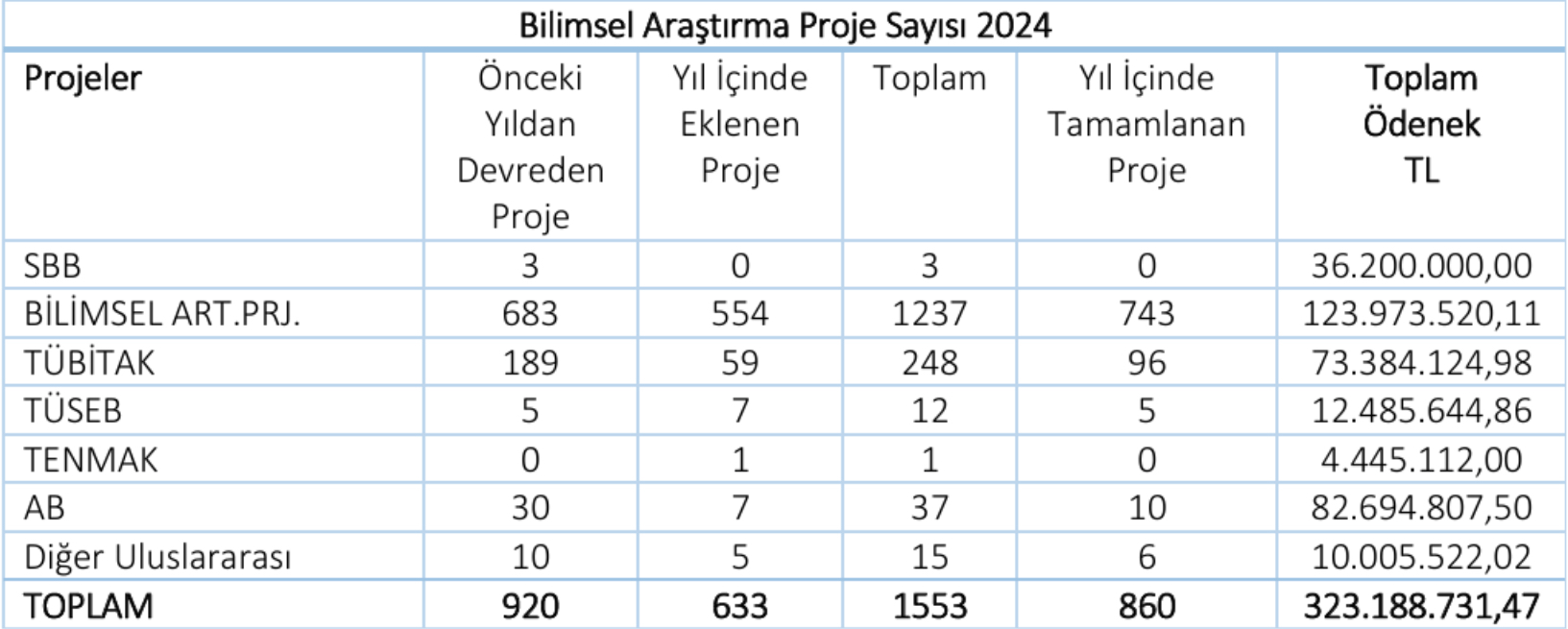 Aşağıdaki “2025 Yılı Mali Durum ve Beklentiler Raporu”na göre 2025 yılının ilk yarısında üniversite bütçesinden bilimsel projelere ayrılan tutar 73.616.000 TL oldu. Yurt içi ve yurt dışından sağlanan çeşitli ek kaynaklar ile beraber bu miktar yaklaşık 200 milyon TL seviyesine ulaştı.