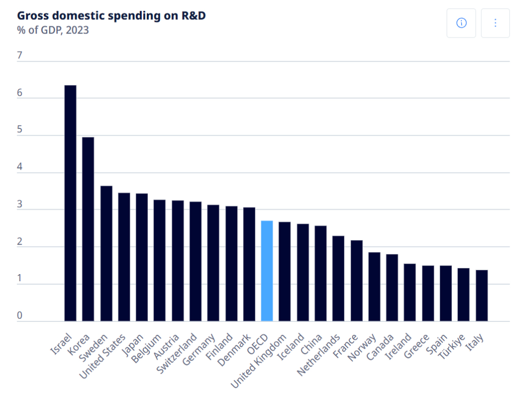 Aşağıdaki grafik, ülkelerin AR-GE harcamalarının Gayri Safi Yurt İçi Hasılatı (GSYİH) içindeki payını gösteriyor. OECD ortalaması %2,7 seviyesindeyken Türkiye’nin AR-GE’ye ayırdığı pay yalnızca %1,4.