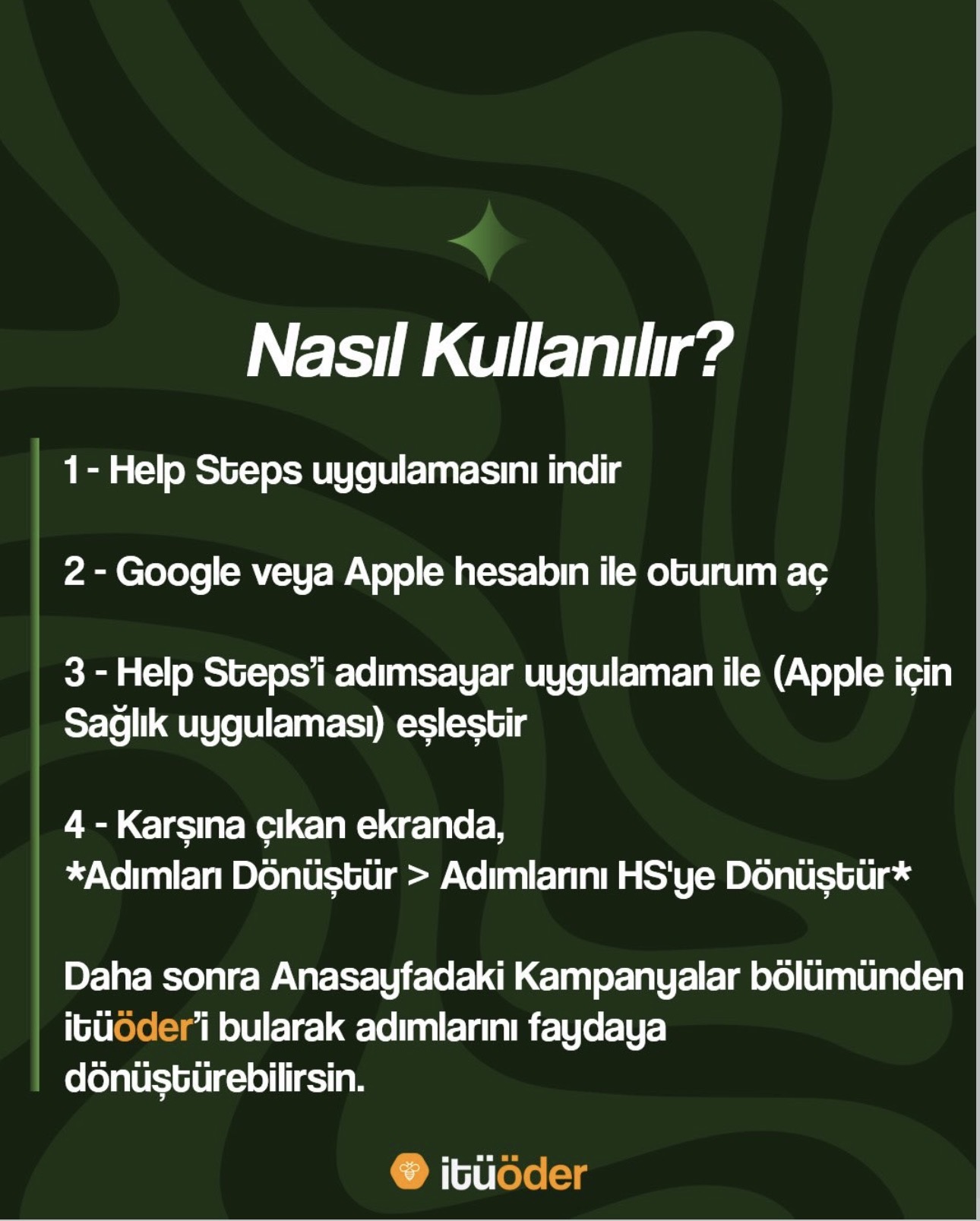Süreci başlatmak için Help Steps uygulamasını telefonunuza indirip EB53790092470 davet koduyla oturum açmanız yeterli. Ardından hesabınızı, telefonunuzun yerleşik adımsayar uygulamasıyla (örneğin Apple için Sağlık uygulaması) eşleştirmeniz gerekiyor. Gün sonunda ise tek yapmanız gereken; ekrandaki "Adımları Dönüştür > "Adımlarını HS'ye Dönüştür" seçeneklerine tıklayarak günlük adımlarınızı uygulama puanına çevirmek. Son olarak ana sayfadaki "Kampanyalar" bölümünden itüöder’i bularak biriktirdiğiniz puanları kolayca bağışlayabilirsiniz.
