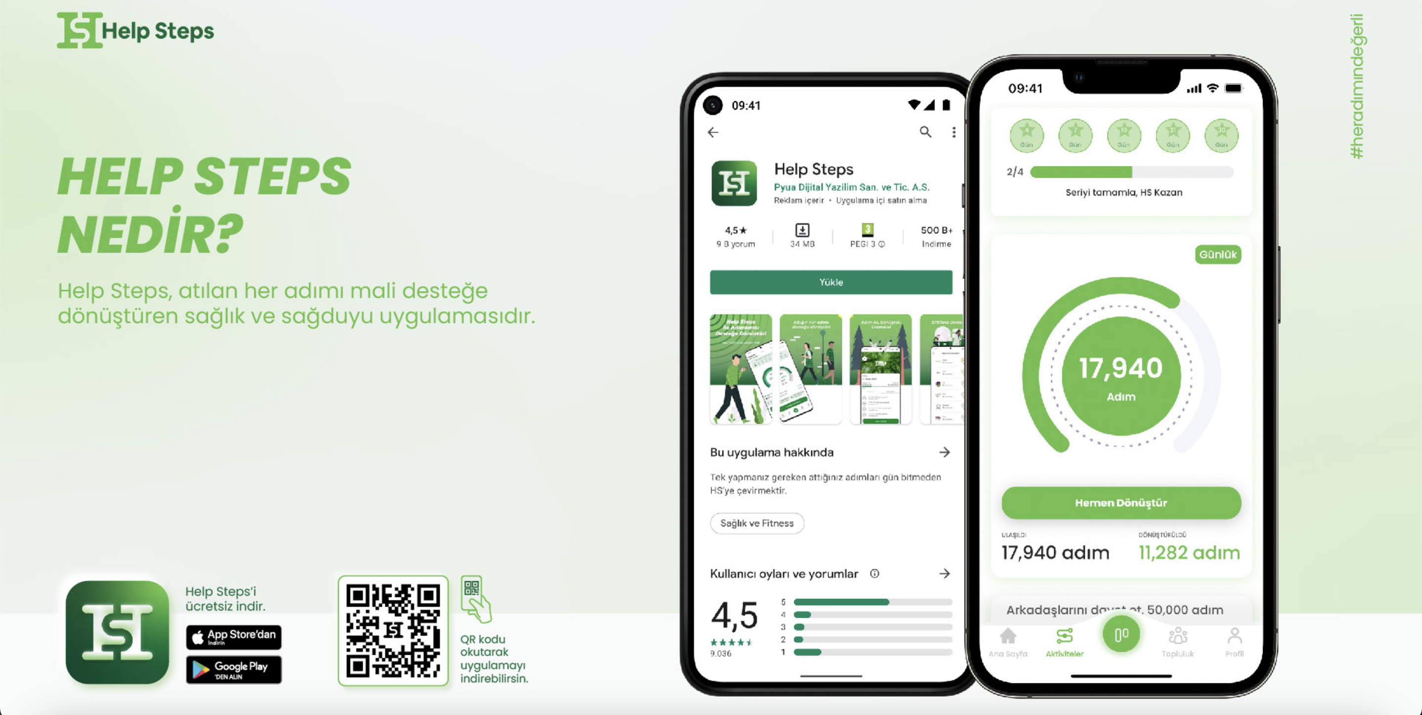 Help Steps, kullanıcıların günlük yürüme faaliyetlerini takip eden ve bu adımları dijital puanlara dönüştüren bir mobil uygulamadır. "Yürüdükçe Help Steps puanı kazan, kazandığın puanları uygulamada bağış olarak kullan" misyonuyla kurulan uygulamada kullanıcılar, adımlarıyla biriktirdikleri bu puanları uygulama içerisinde listelenen çeşitli sivil toplum kuruluşları ve sosyal sorumluluk projelerine bağışlayarak toplumsal fayda sağlayabilirler.